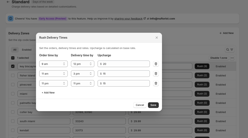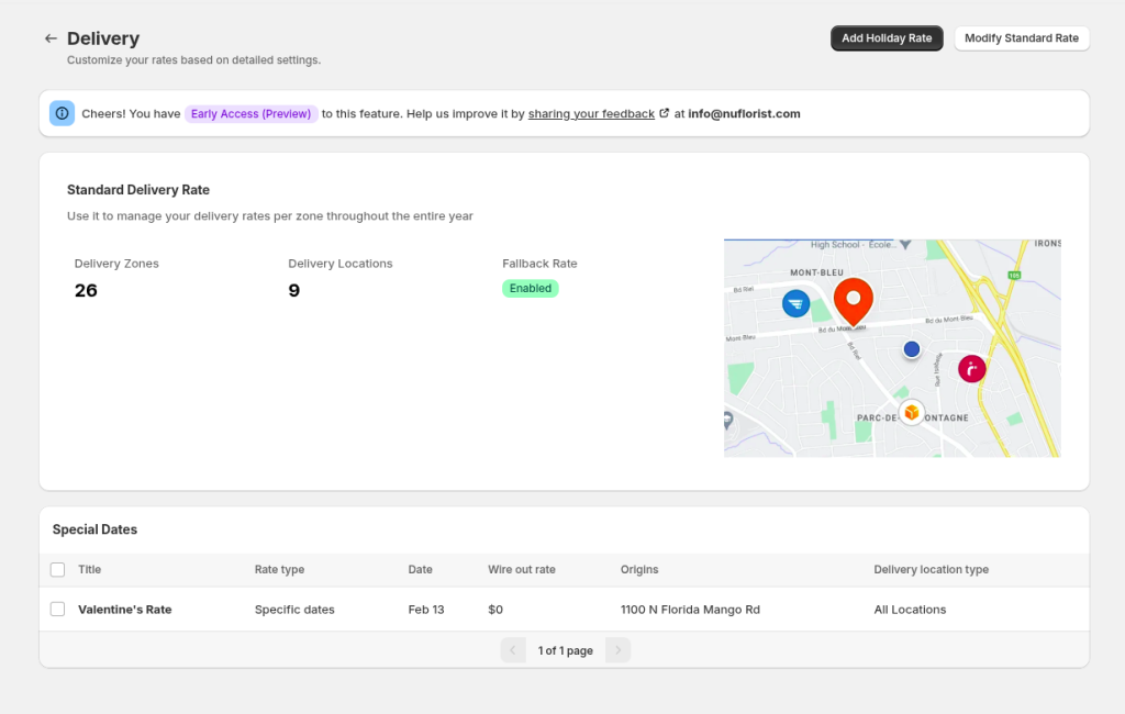 We also understand that holidays can bring unique delivery challenges. With our holiday rates, you can keep your standard pricing year-round but override delivery zone or rush delivery rates for specific dates or date ranges. This ensures you can maintain profitability during peak periods without extra manual work.