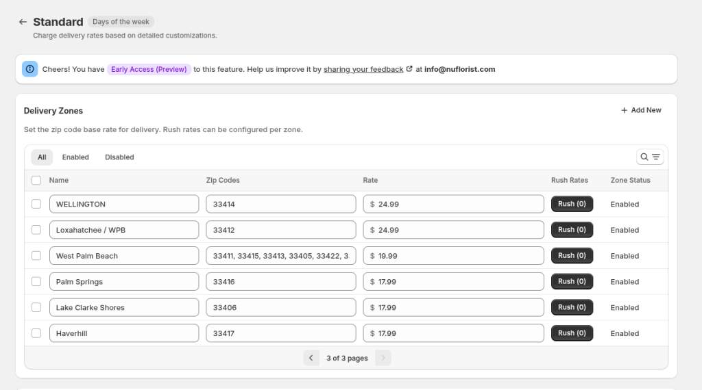 You can now group zip codes into delivery zones and assign specific delivery dates to each zone. This allows you to plan ahead, optimize routes, and manage your workflow more efficiently. Busy days? No problem — you can enable or disable delivery zones as needed, giving you the flexibility to focus on what matters most.