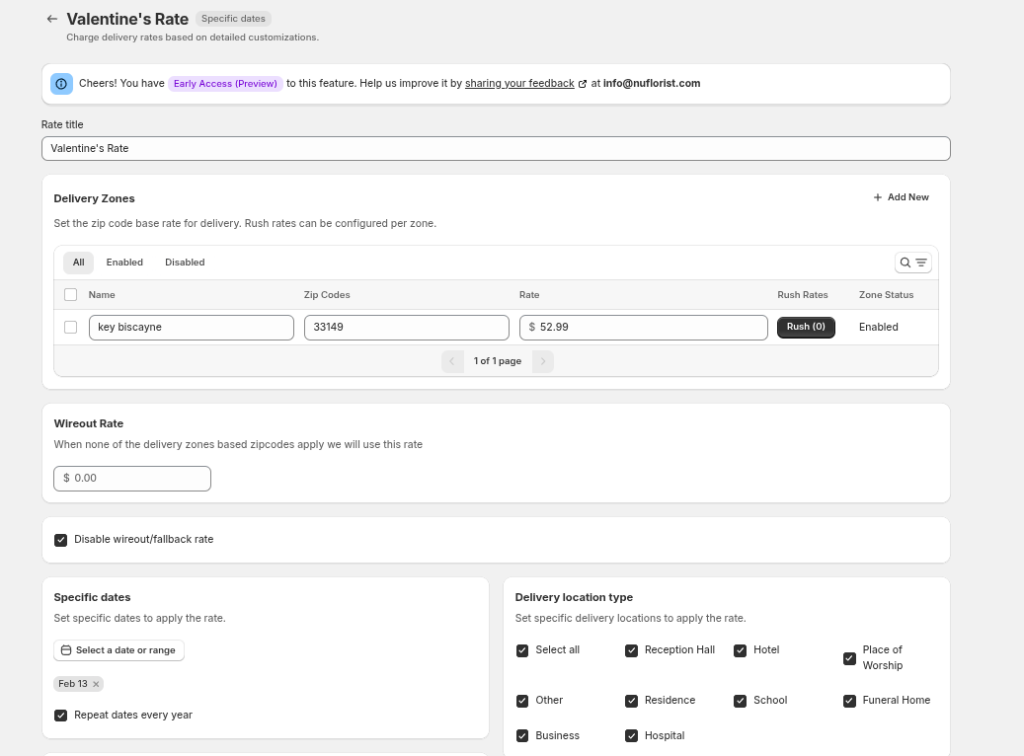 We’ve added a wire-out or fallback rate for deliveries outside your defined delivery zones, including out-of-state locations. When a customer enters a zip code that doesn’t match any delivery zone, this rate is applied automatically. You also have the option to disable this feature entirely if you don’t want to offer delivery outside your designated zones, giving you full control over where you deliver.